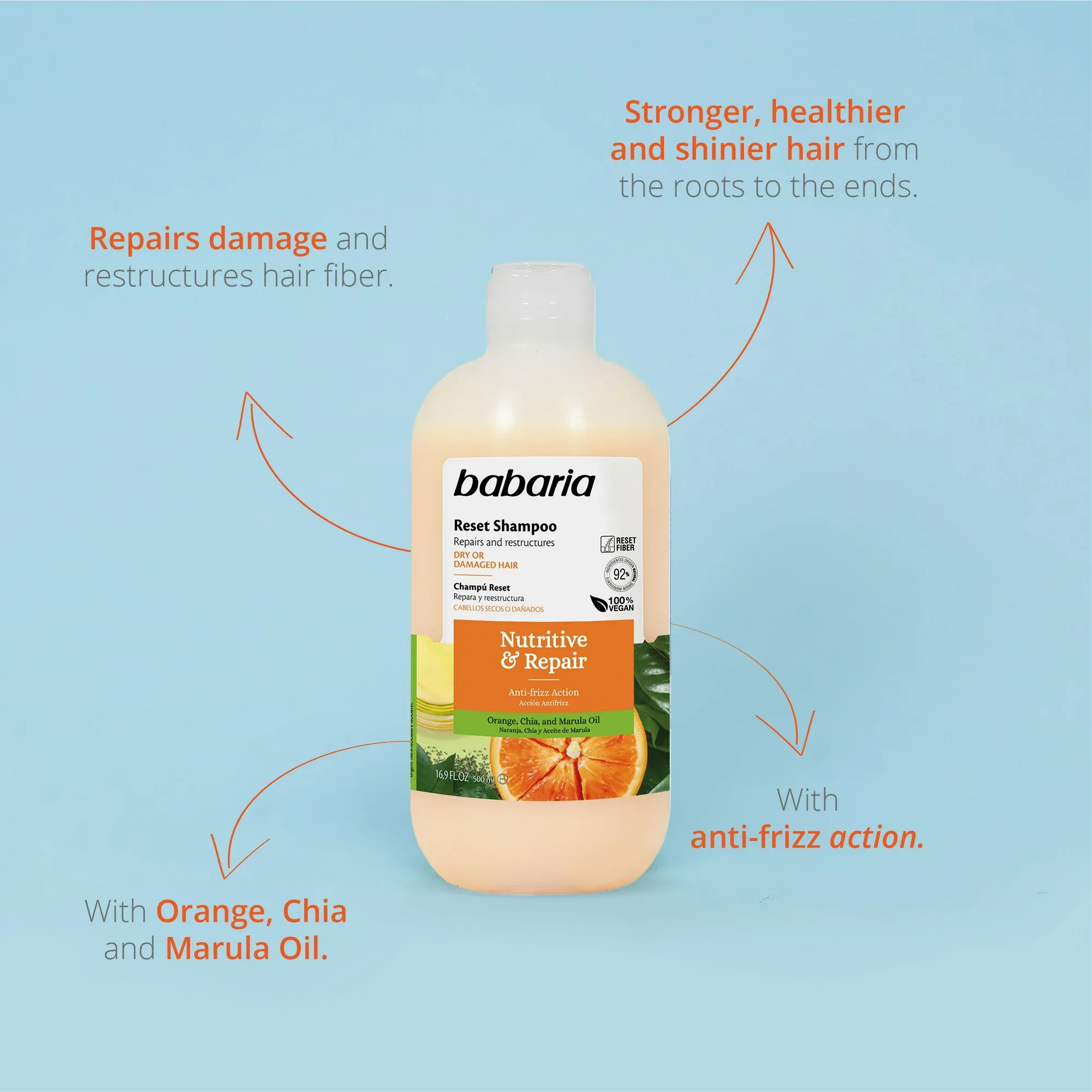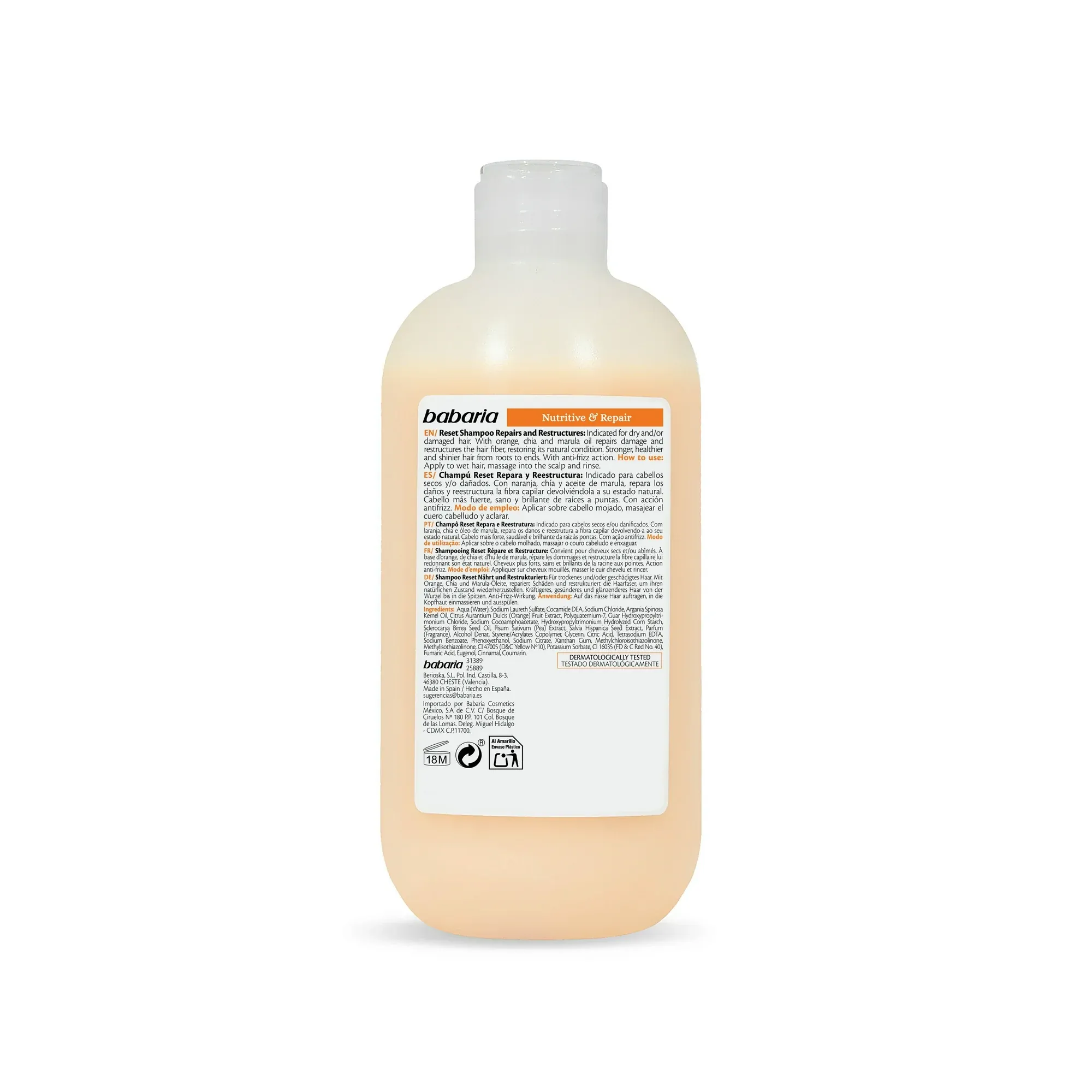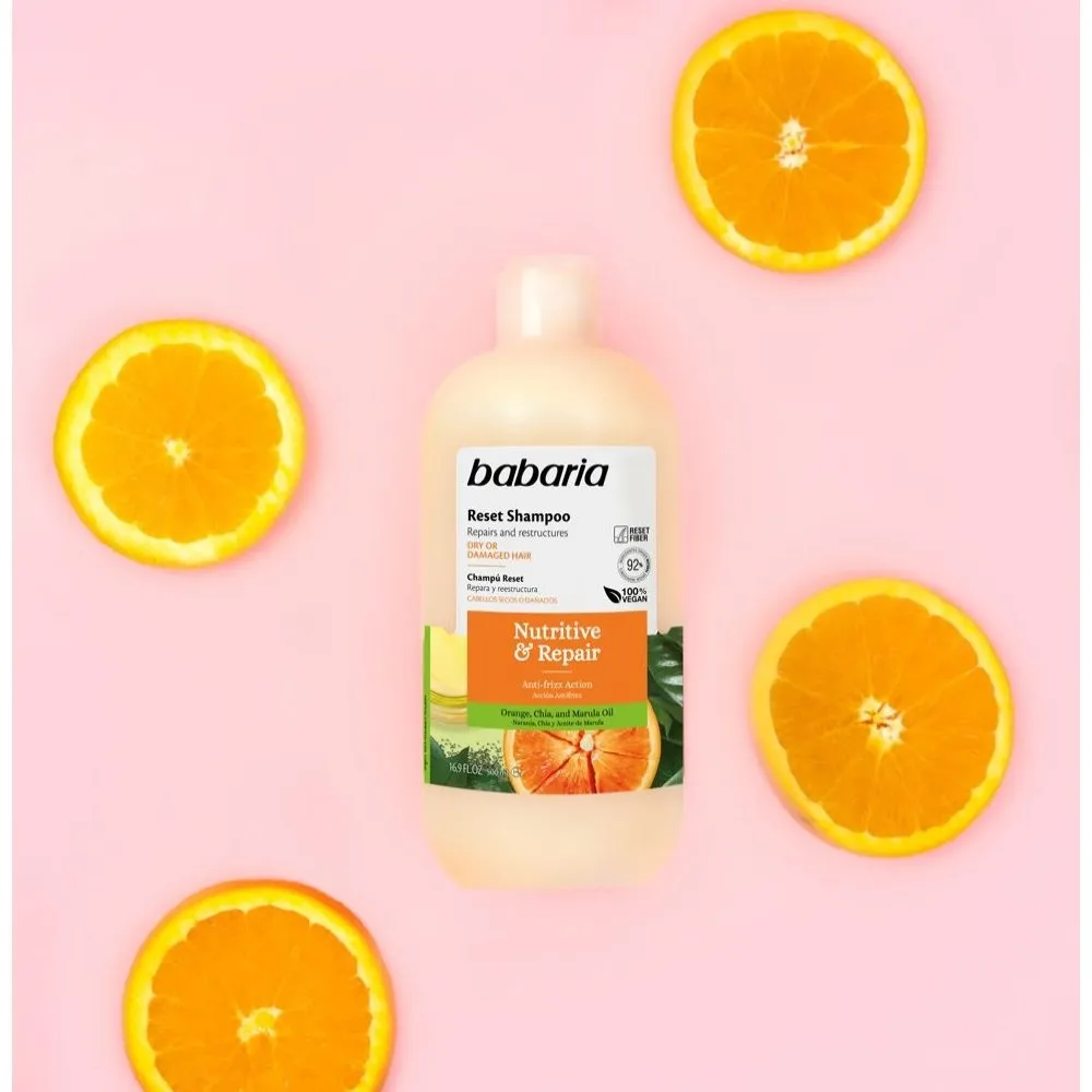 شامپو مغذی و ترمیمکننده باباریا (Babaria Nutritive & Repair Reset Shampoo) یک محصول تخصصی برای بازسازی و تقویت موهای خشک و آسیبدیده است. این شامپو با ترکیب روغن پرتقال، دانه چیا و روغن مارولا، فیبر مو را ترمیم کرده و استحکام و سلامت از دسترفتهی مو را بازمیگرداند. استفاده منظم از این شامپو موجب کاهش وز، افزایش نرمی، لطافت و درخشندگی طبیعی موها میشود.
