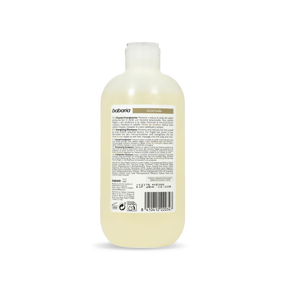 شامپو انرژیزا و ضدریزش باباریا (Babaria S.O.S Caída Energizing Shampoo) یک انتخاب عالی برای افرادی است که از ریزش مو رنج میبرند یا موهای ضعیف و کمجان دارند. این شامپو با ترکیبات گیاهی مؤثر شامل جینسینگ، زردچوبه و مواد معدنی، گردش خون پوست سر را تحریک کرده و به تقویت فولیکولها و فیبر مو کمک میکند. استفاده منظم از آن باعث کاهش ریزش، استحکام بیشتر تارهای مو و رشد سالمتر موها میشود.