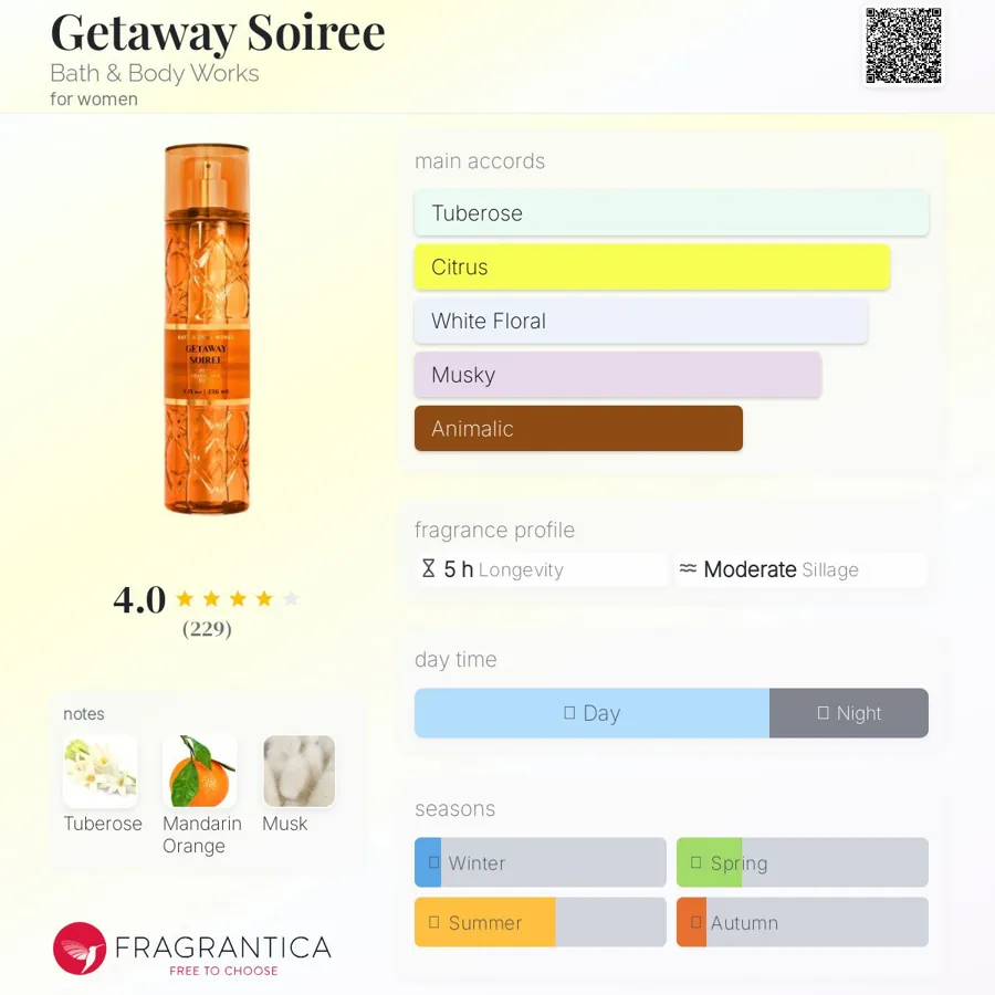 بادی میست بث اند بادی ورکز مدل Getaway Soiree با رایحهای روشن، گلی و مرکباتی، یکی از شادابترین و خاصترین بادی میستهای این برند آمریکایی است. این اسپری بدن الهامگرفته از عطر معروف Tom Ford Soleil Blanc است و حس گرما و تازگی تابستانی را در خود دارد. ترکیب گل مریم، پرتقال ماندارین و مشک سفید، عطری تمیز، لطیف و زنانه خلق کرده است که برای استفاده روزانه و فصول گرم سال بینظیر است.