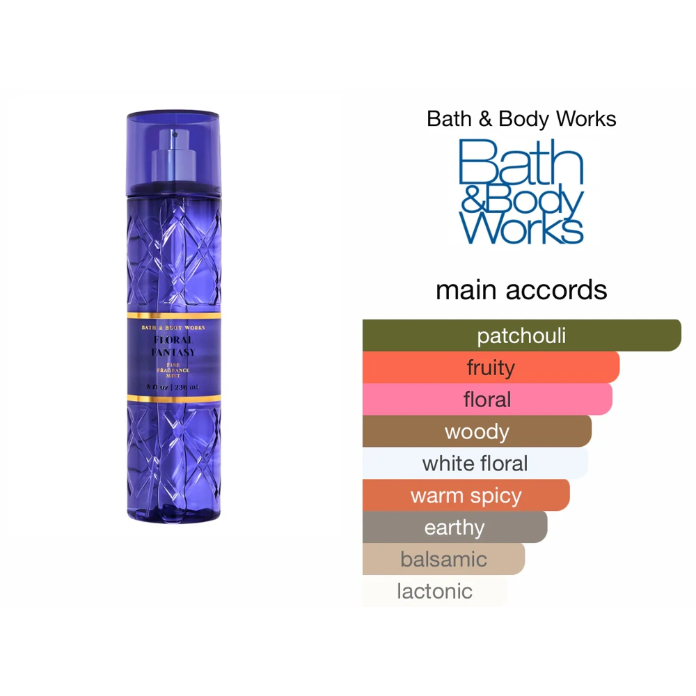 بادی میست بث اند بادی ورکز مدل Floral Fantasy حجم 236 میل، رایحهای زنانه، لطیف و شاداب دارد که حس شکفتن گلها در باغی پر از طراوت را تداعی میکند. این بادی میست الهامگرفته از عطر معروف Flowerbomb از برند Viktor & Rolf است و ترکیبی دلانگیز از نتهای گلی، میوهای و چوبی را ارائه میدهد.