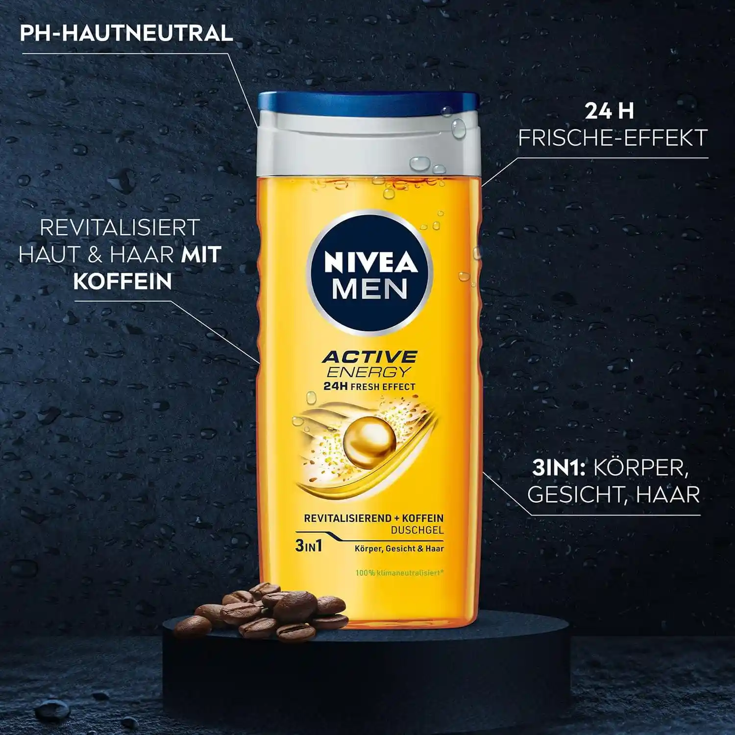 ژل شستشوی نیوآ Nivea Men Active Energy یک شوینده 3در1 برای بدن، صورت و مو است که با فرمول حاوی کافئین، به پوست و مو انرژی میبخشد و حس شادابی 24 ساعته ایجاد میکند. این محصول با بافت سبک، کف مناسب و شستشوی راحت، برای آقایانی طراحی شده که یک محصول کامل و کاربردی در روتین روزانه خود میخواهند.