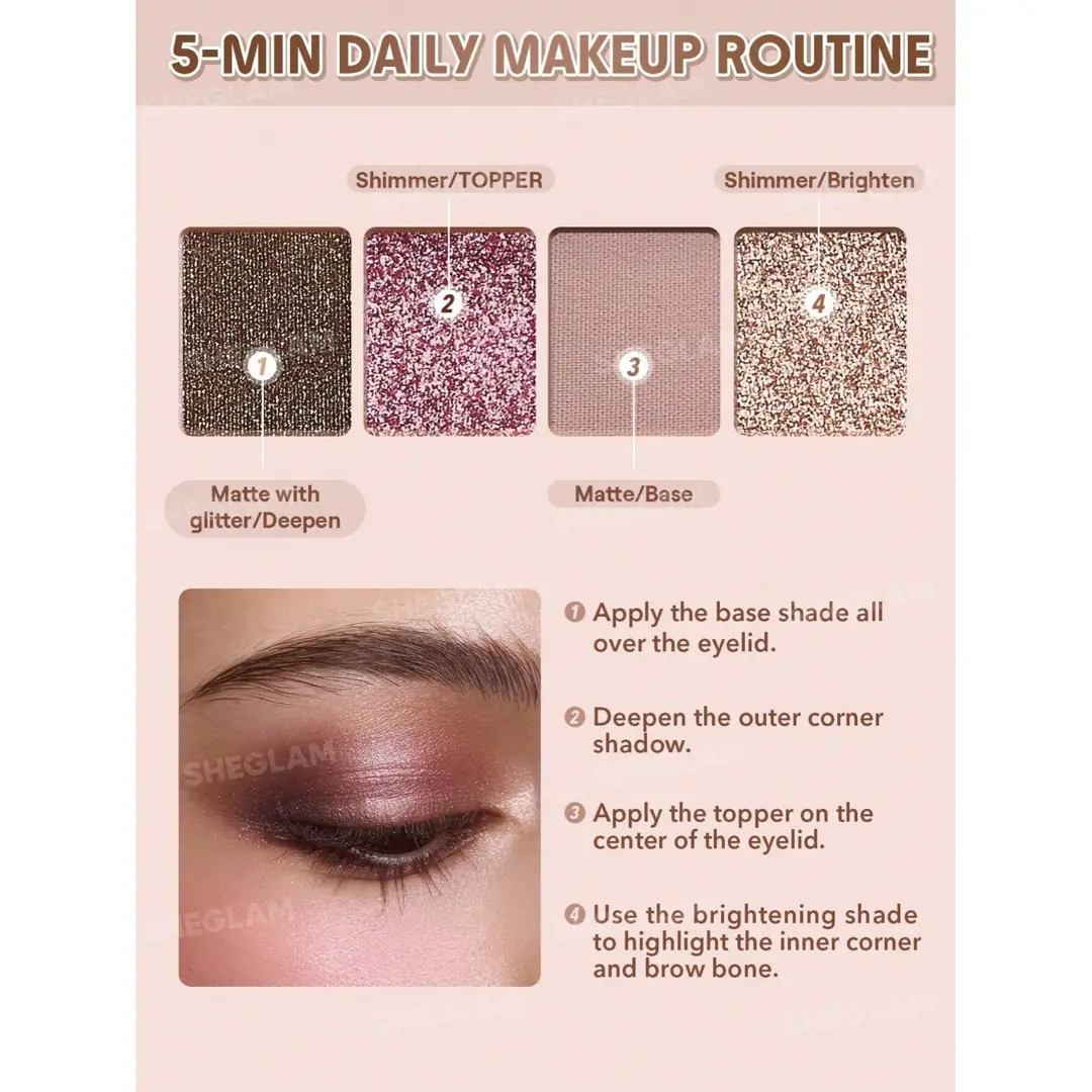 ابتدا از رنگهای مات روشنتر بهعنوان پایه روی پلک استفاده کنید. سپس رنگهای تیرهتر را برای ایجاد عمق در گوشه خارجی چشم به کار ببرید و در نهایت با رنگ شاین، جلوهای درخشان به مرکز پلک اضافه کنید.