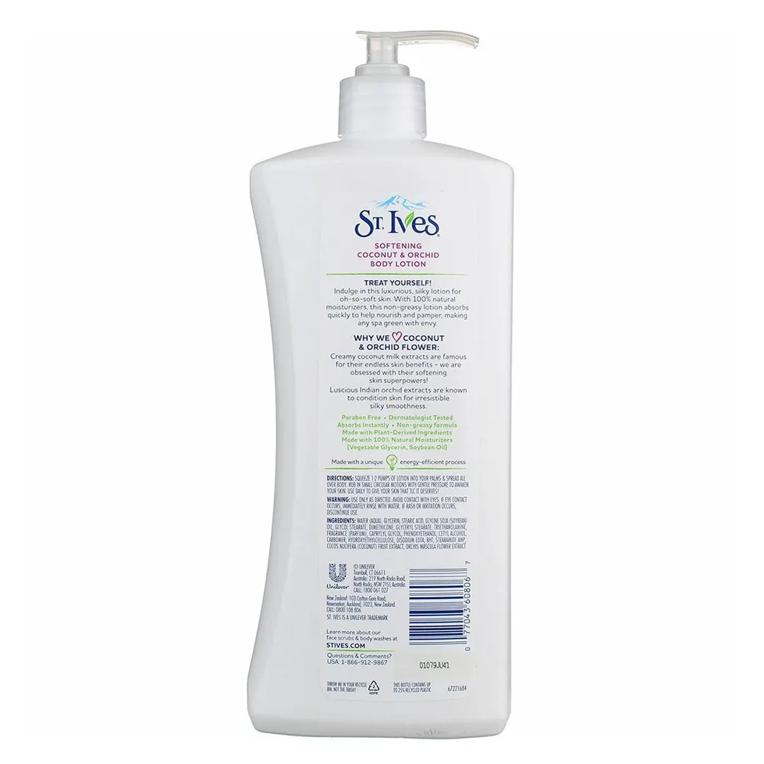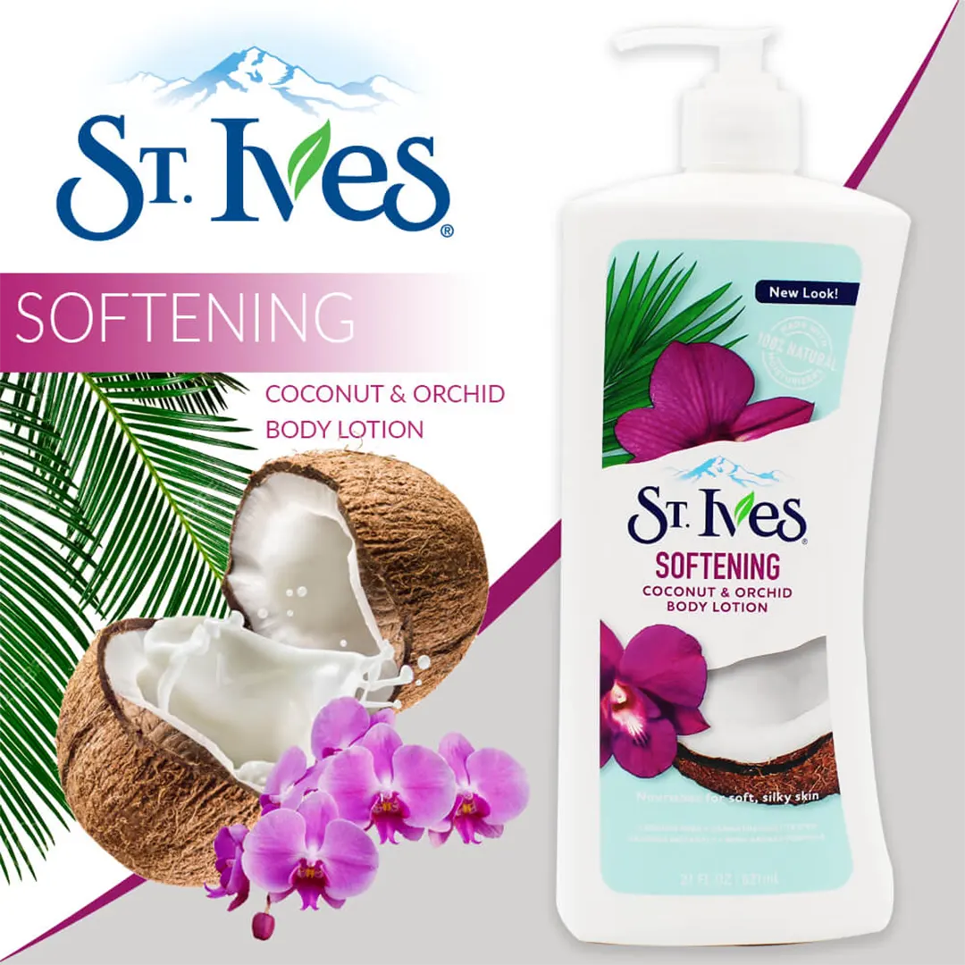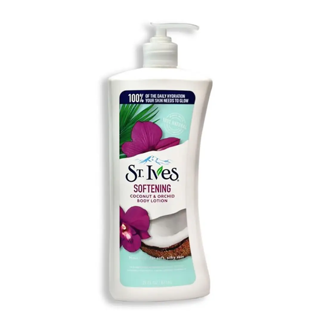 لوسیون بدن نرم کننده Softening از برند محبوب سینت ایوز St.Ives با عصاره و رایحه ی شیر نارگیل و گل ارکیده به شکل فوق العاده ای پوست شما را مرطوب خواهد کرد. این لوسیون یک مرطوب کننده صد در صد طبیعی بوده که اثری از چربی روی بدن باقی نمی گذارد.عصاره طبیعی ارکیده موجود در این لوسیون، پس از استفاده به آرامی جذب پوست می شود و عطر خوب این گل خوشبو را روی پوست بدن بر جای میگذارد و به شما حس زیبای تازگی و طراوت را هدیه کند. در ساخت این محصول از مرطوب کنندههای صد در صد گیاهی چون گلیسیرین گیاهی، روغن سویا، عصاره نارگیل و ارکیده استفاده شده است و هیچ گونه ماده حیوانی در آن به کار نرفته است و مورد تایید متخصصان پوست می باشدتمام بادی لوشن های سینت ایوز برای نرم کردن پوست، نگه داشتن رطوبت طبیعی و مراقبت از پوست در برابر آب و هوای خشک، سرما و گرمای شدید ساخته شده اند و انعطاف پذیری و قابلیت ارتجاعی پوست را بیشتر می کنند.