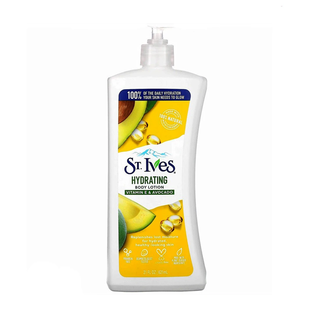 لوسیون بدن آبرسان سنت ایوز (St. Ives Hydrating Vitamin E & Avocado Body Lotion)، با ترکیبات غنی از ویتامین E و آووکادو، رطوبت از دست رفته بدن را بازمیگرداند و پوست را شاداب و آبرسانی میکند. این محصول با استفاده از آبرسانها و مرطوبکنندههای کاملاً طبیعی مانند روغن دانه سویا و گلیسرین گیاهی تهیه شده است. آووکادوی موجود در لوسیون سنت ایوز از مزارع آفریقای جنوبی، کنیا و مکزیک تأمین میشود، و ویتامین E موجود در آن، به صاف و یکدست شدن پوست کمک میکند.