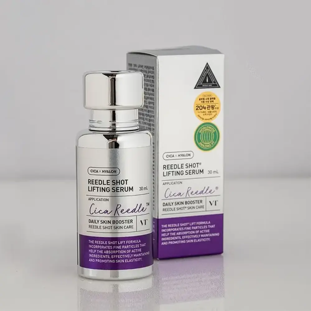 سرم لیفتینگ صورت وی تی کازمتیک Reedle Shot یک سرم پیشرفته ضدپیری با عملکردی مشابه میکرونیدلینگ است که با استفاده از فناوری CICA REEDLE™ جذب مواد فعال را تا لایههای عمیقتر پوست افزایش میدهد. این سرم با ترکیبی قدرتمند از استیل هگزاپپتید-8، عصاره محیط کشت سلولهای بنیادی مزانشیمی بند ناف انسان، کلاژن، الاستین و هیالورونیک اسید طراحی شده تا پوستهای افتاده، خسته و مستعد پیری را احیا کرده، لیفت و سفت کند. بافت سبک، زودجذب و غیرچسبنده آن، این محصول را به گزینهای ایدهآل برای مراقبت روزانه حتی برای پوستهای حساس تبدیل کرده است.